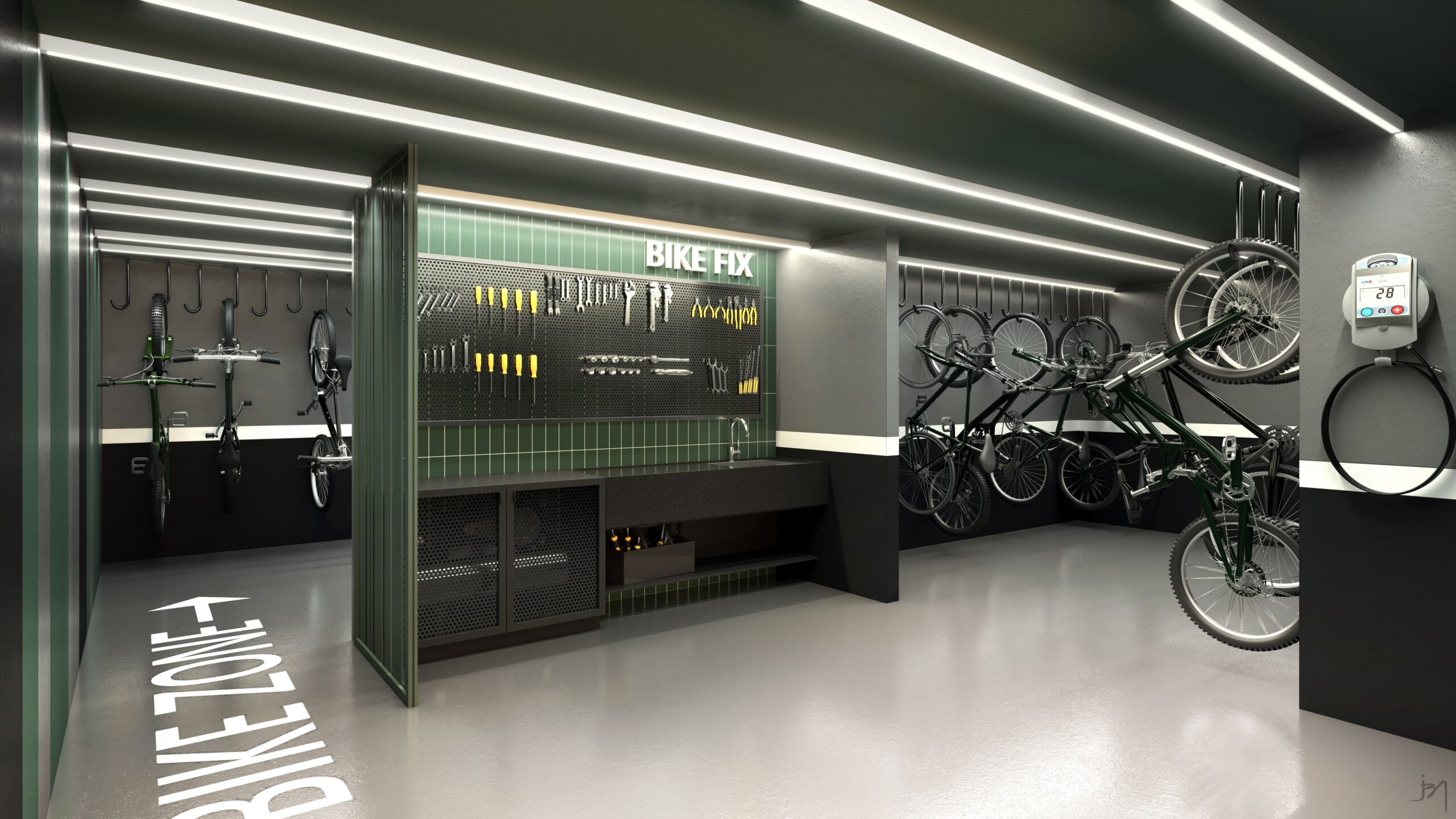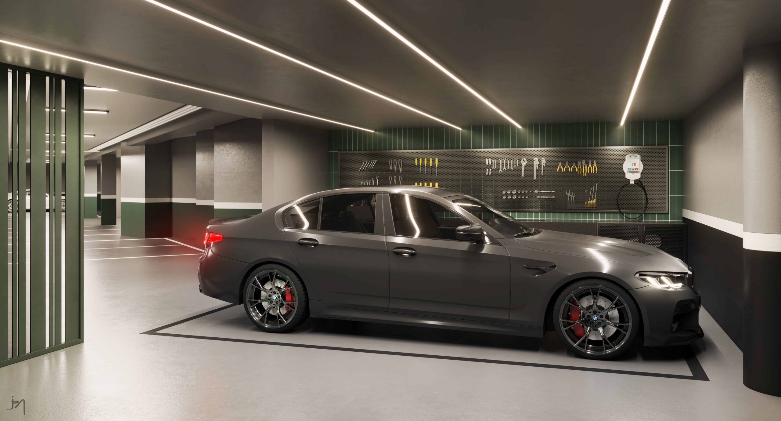 * O sistema proposto de carregamento é de tomada comum, porém dedicada. Este sistema permitirá ao usuário fazer o carregamento do veículo conforme as normas padrões normalizadas pela norma IEC 61851, a saber: Modo 1: Utilizando apenas o modo de carregamento do veículo ligado à tomada (carregamento lento). Modo 2: Utilizando cabo de carregamento com caixa de controle e proteção incorporada na mesma, ligada à tomada (carregamento lento). Atenção: Os cabos de carregamento, com ou sem caixa de controle, são de responsabilidade do usuário e não serão fornecidos pela construtora, que também não fornecerá qualquer tipo de to- mada específica ou adaptadores para tomada comum/plugs de carregamento, que ficarão a cargo do usuário. A construtora deixa claro que não fornecerá o respectivo carregador residencial e que, para o carregamento de modo seguro a partir da tomada comum, se deverá dispor de um cabo com caixa de proteção e controle (Modo 2 de carregamento). A tomada prevista para carregamento de carro elétrico será alimentada após a medição do apartamento, com proteção por disjuntor com corrente nominal máxima de 16A e dispositivo de proteção diferencial residual (DR) para corrente de fuga à terra. A tomada será instalada em caixa de cadeado ou chave para uso exclusivo do morador na sua respectiva vaga de estacionamento. A construtora apresenta uma solução para as vagas que não possuem parede ou pilares próximos.